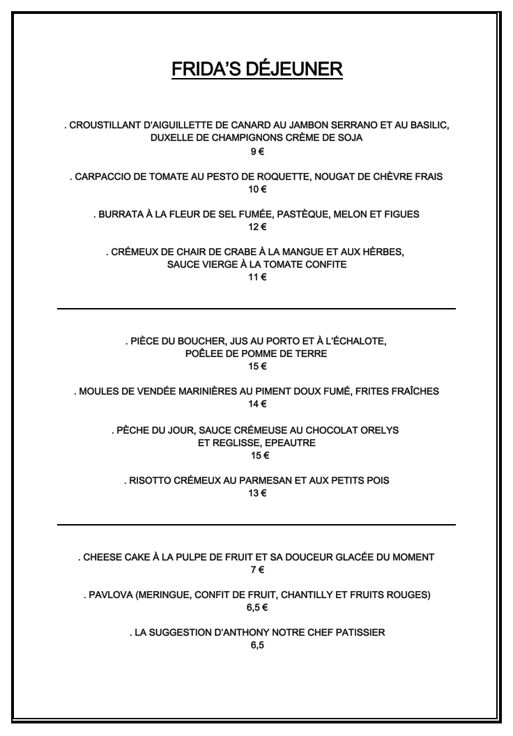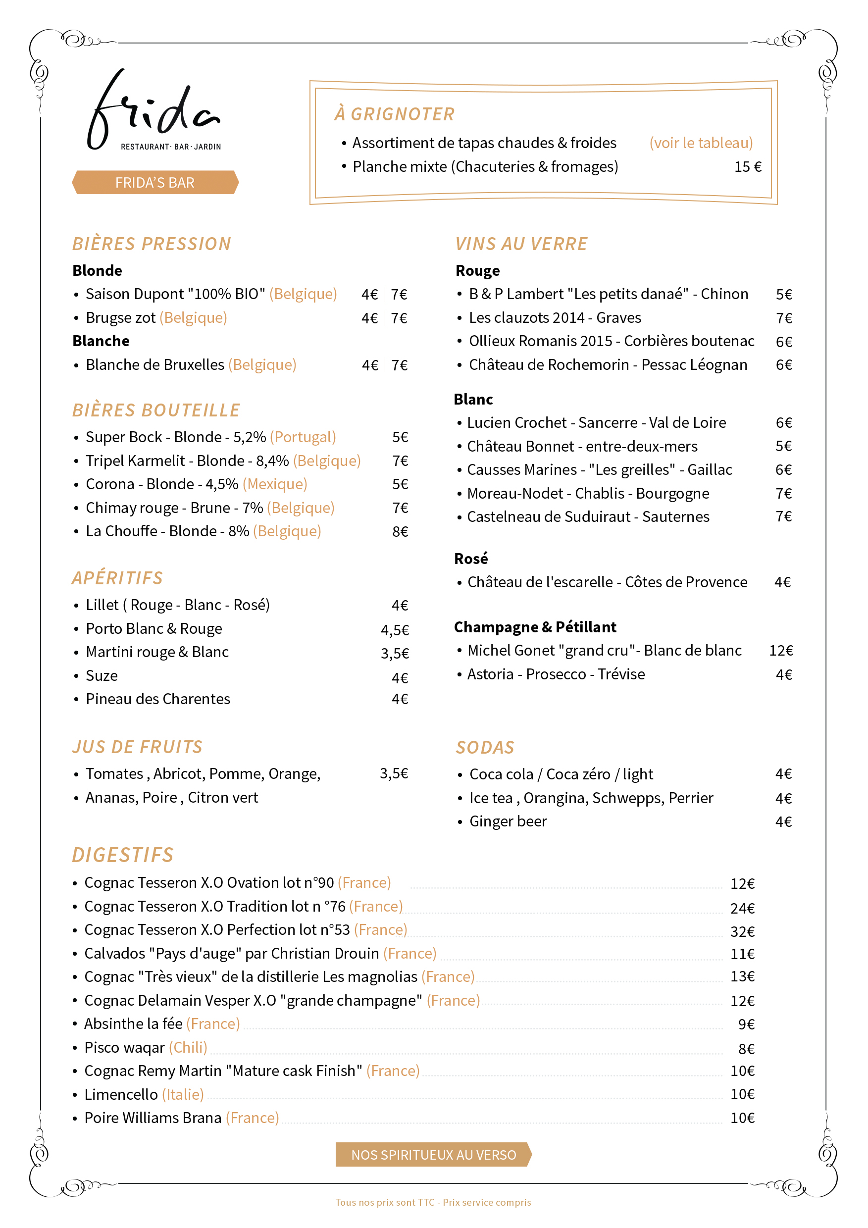 Chez FRIDA, la qualité et le goût sont nos valeurs premières. Venez découvrir nos cocktails soigneusement préparés par le barmen-mixologiste et découvrir la carte des vins spécialement concoctée par le fondateur des lieux Timothé Seguin-Medrinal, par ailleurs sommelier. Au menu ? Bordeaux, Bourgogne, Languedoc, Loire mais aussi vins d’Autriche, d’Italie, de Grèce, du Portugal et bien sûr du Nouveau-Monde.