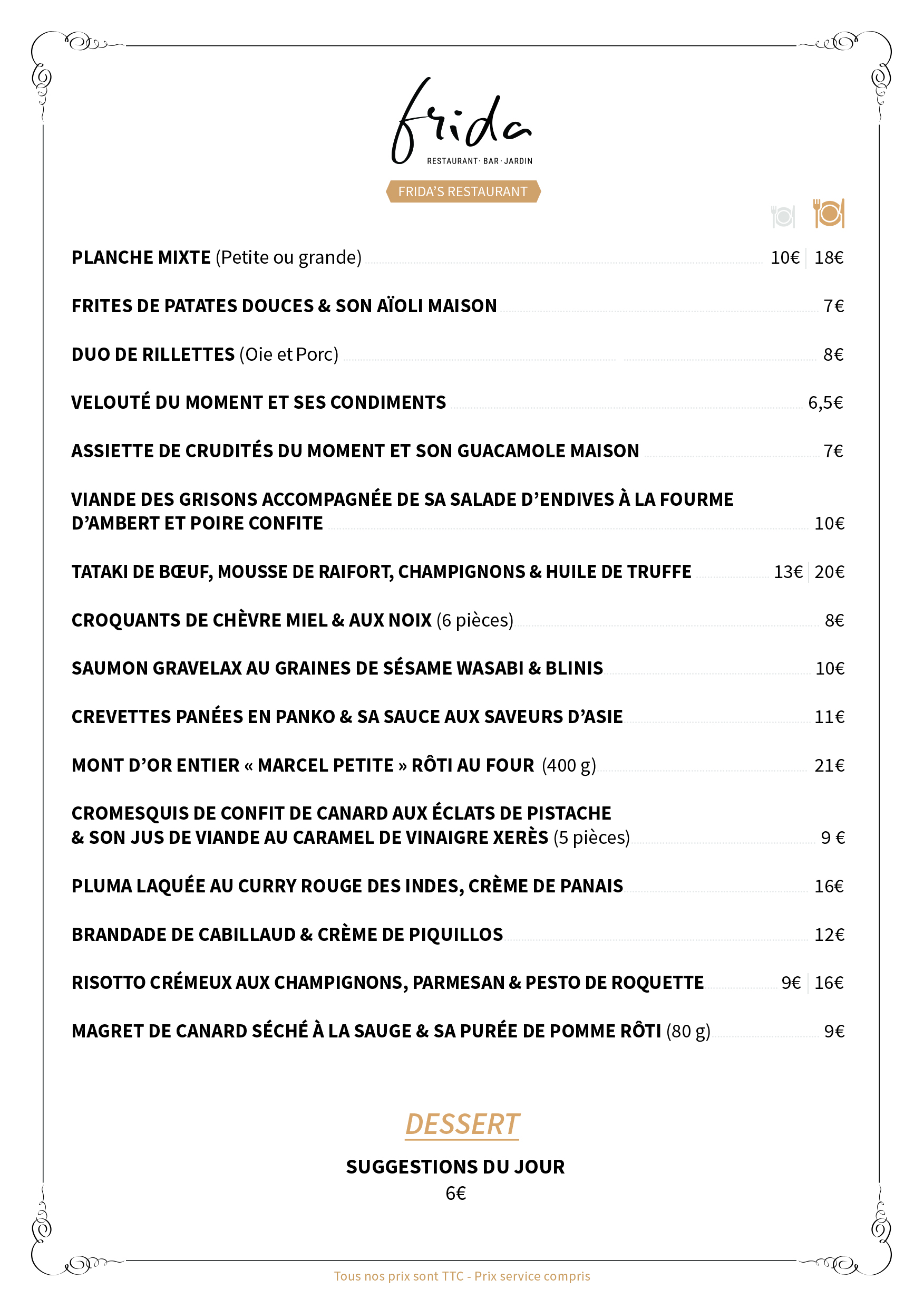FRIDA est un restaurant, un bar à vin et un bar à cocktail niché au cœur du vieux Bordeaux. Venez y déguster des tapas aux notes méditerranéennes, y goûter une cuisine bistronomique revisitée ou y siroter une délicieuse boisson. Nous vous accueillons au sein de nos quatre espaces chaleureux : notre jardin d’intérieur aux couleurs exotiques et à l’esprit ginguette-chic; notre bar à cocktail et son étonnant cabinet de curiosité; notre salle de restaurant et son allure art-déco; notre salon Hemingway et son âme rococo unique.